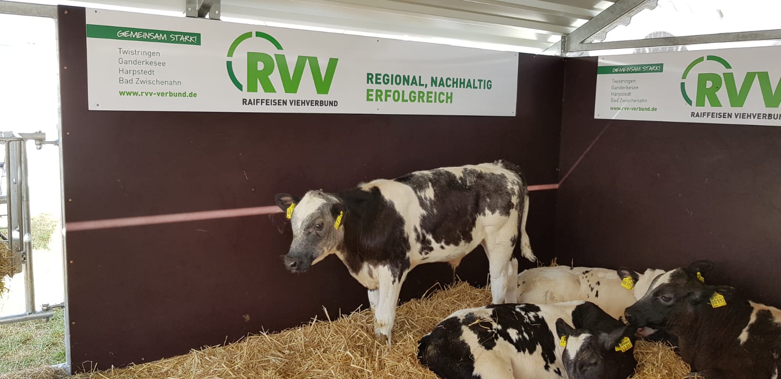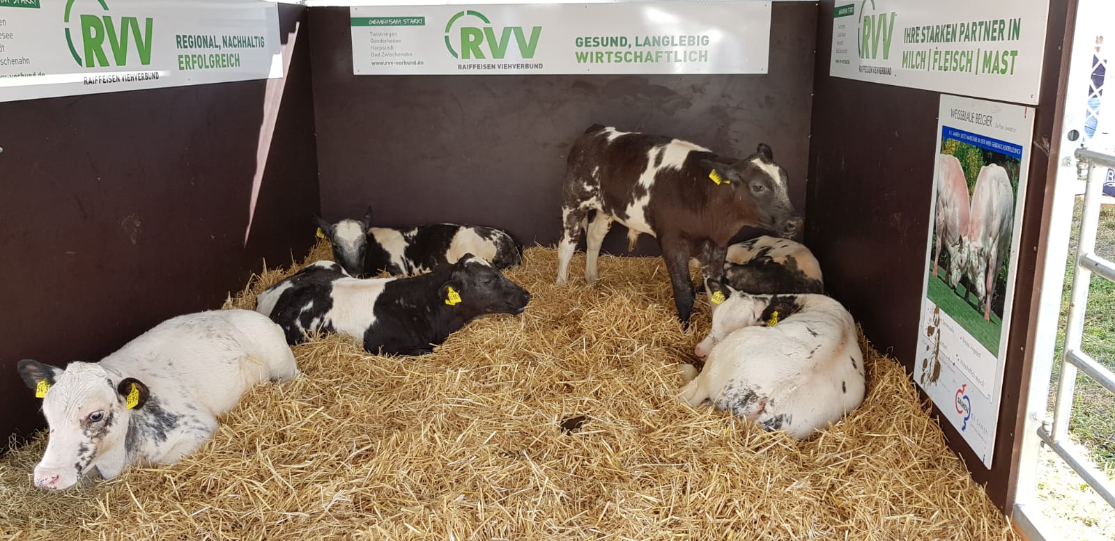 Einen Anziehungsmagneten bildeten unsere sechs Ausstellungskälber. Diese Tiere, eine Kreuzung aus schwarzbunt und weißblaue Belgier waren etwa drei Monate alt und wurden ad-libitum getränkt. Besonders bei vielen Rindermästern weckten unsere Kälber großes Interesse.