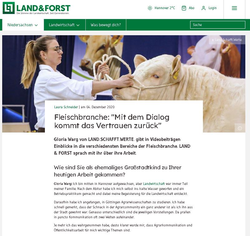 Lesen Sie hier das Interview in der LAND & FORST von Laura Schneider mit Gloria Warg von Land.Schafft.Werte über ihre Arbeit und wie sie mit Videos Einblicke in die verschiedenen Bereiche der Landwirtschaft ermöglicht.