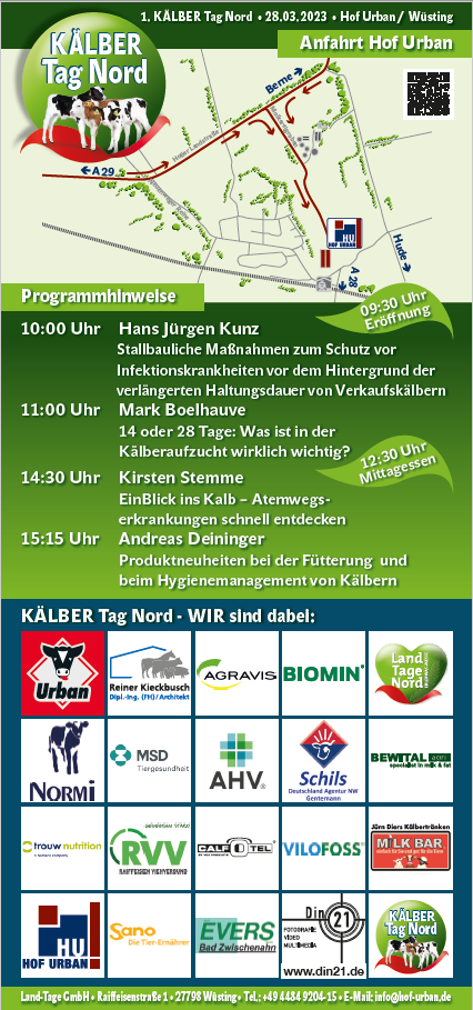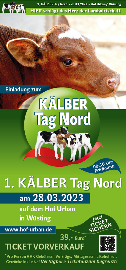 1. Kälber Tag Nord in Wüsting am 28.03.2023 am 24. Februar 2023 Wir sind dabei! Am 28. März 2023 findet auf dem Hof Urban in Wüsting der 1. KÄLBER Tag Nord statt: Hier können Sie den Flyer herunterladen.