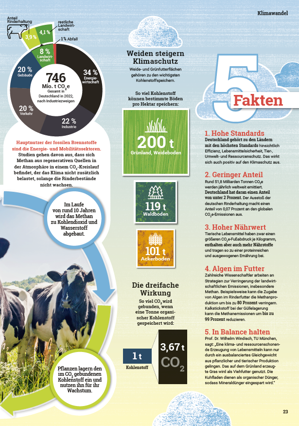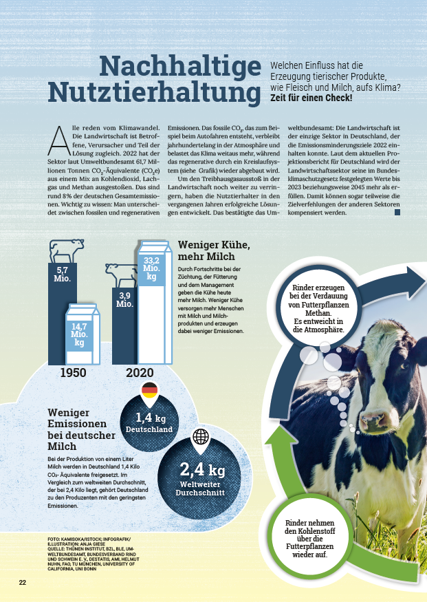 Der Bundesverband Rind und Schwein e.V. teilt mit, dass der Fachbereich Öffentlichkeitsarbeit mit dem Projekt „Rinderfakten“ Faktenblätter und Grafiken rund ums Rind erstellt hat. Die Fachinformationen richten sich an Verbraucher. Mit dem Folgeprojekt „MultiTier“ sollen die Projektergebnisse stärker in die Öffentlichkeit gebracht werden. Hierzu nutzen sie unter anderem das Verbrauchermagazin „Stadt.Land.Wissen“. In der Ausgabe 03/2023 ist beispielsweise zum Thema Klima und Umwelt die folgende Doppelseite „Nachhaltige Nutztierhaltung“ abgebildet.